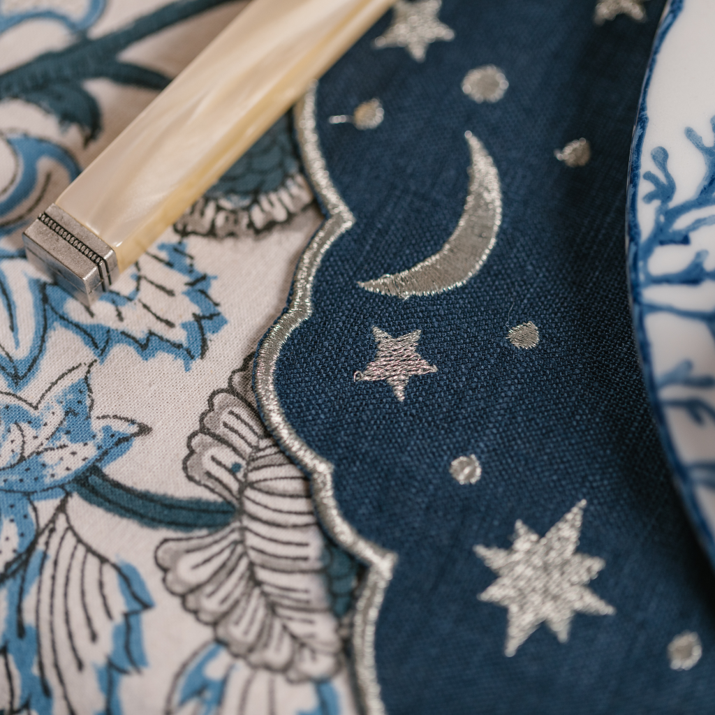 Our Celestial Embroidered Placemat is ideal for stylish festive table dressing. The rich navy linen is decorated with delicate silver star and moon embroidery - this bespoke design is unique to Truffle Tablescapes.